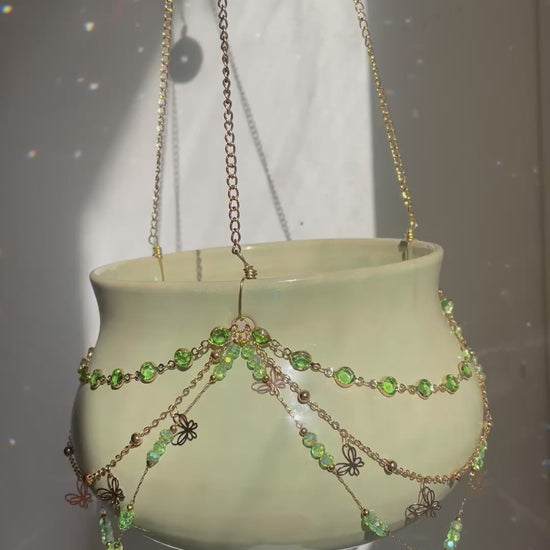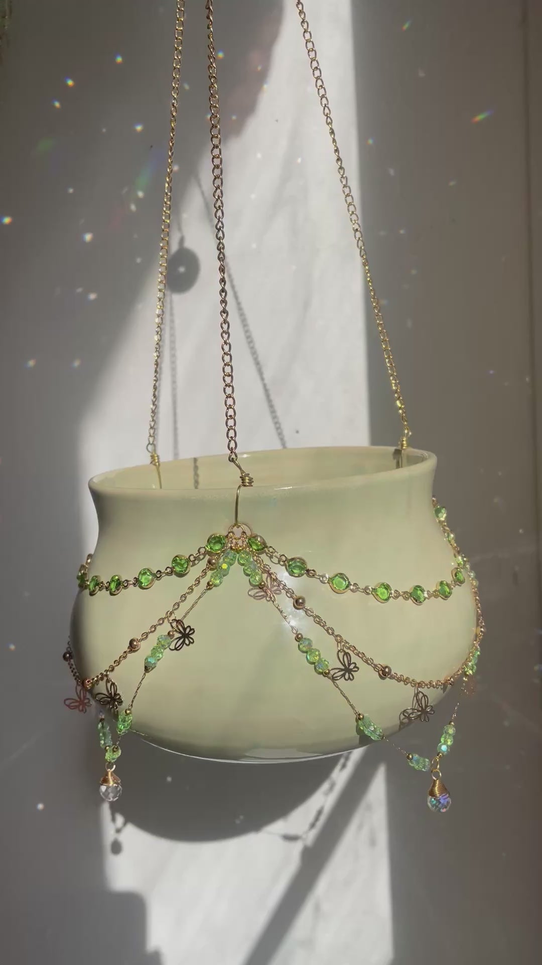 Ceramic vessel thrown on the potter’s wheel and fired to Cone 6, then adorned with jewelry chain and glass prisms to create a magical hanging planter like no other.