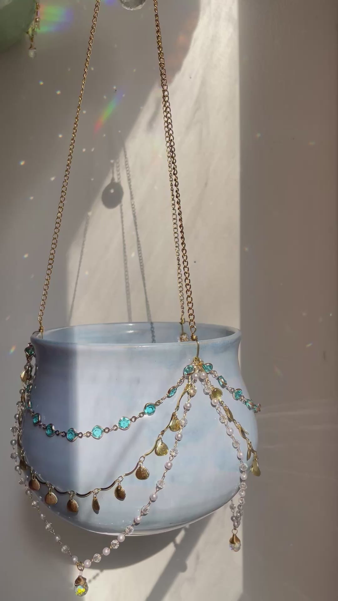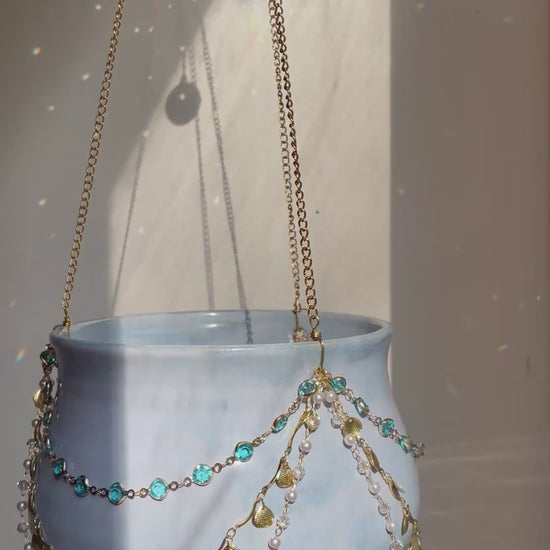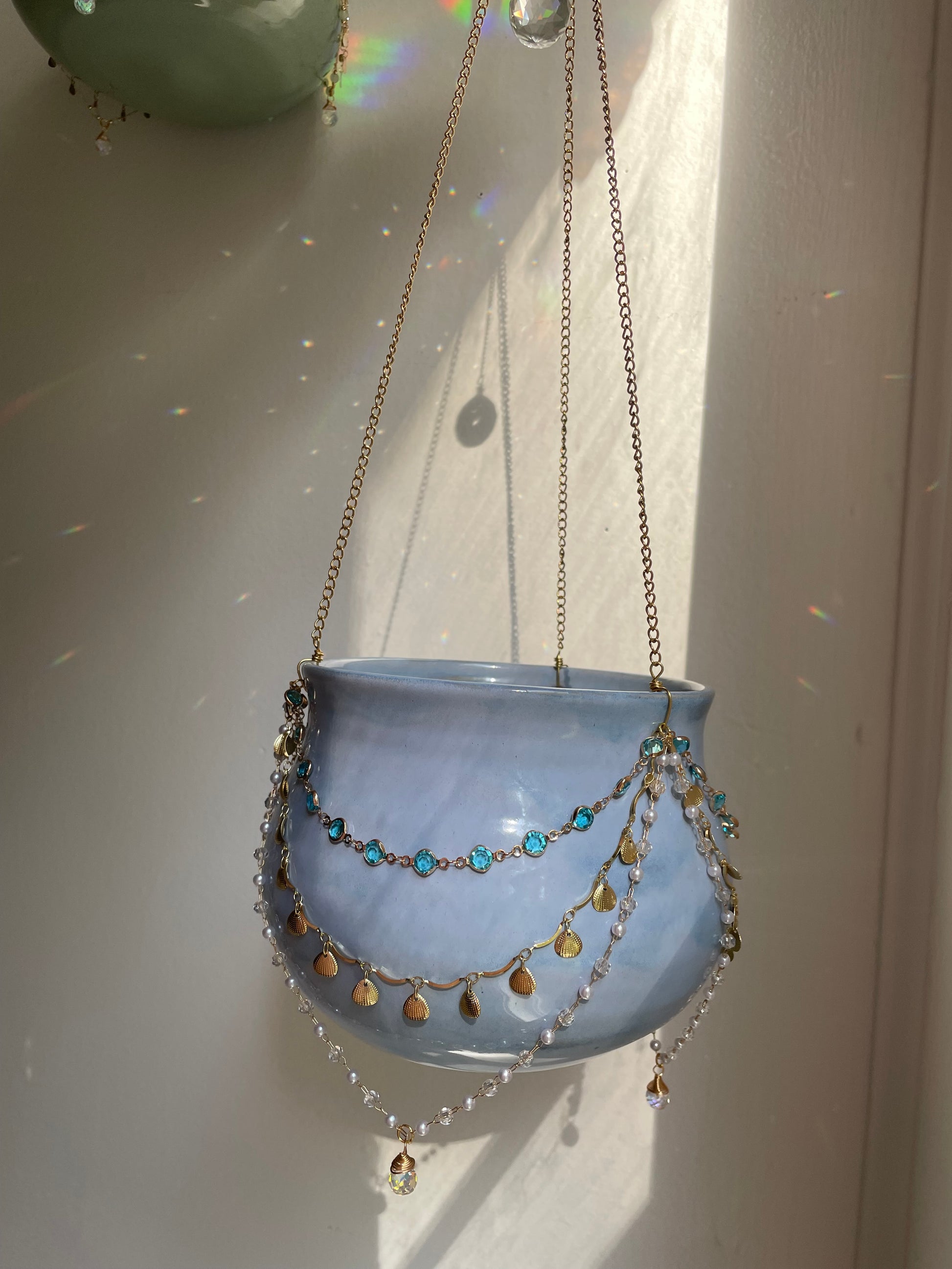 Ceramic vessel thrown on the potter’s wheel and fired to Cone 6, then adorned with jewelry chain and glass prisms to create a magical hanging planter like no other.