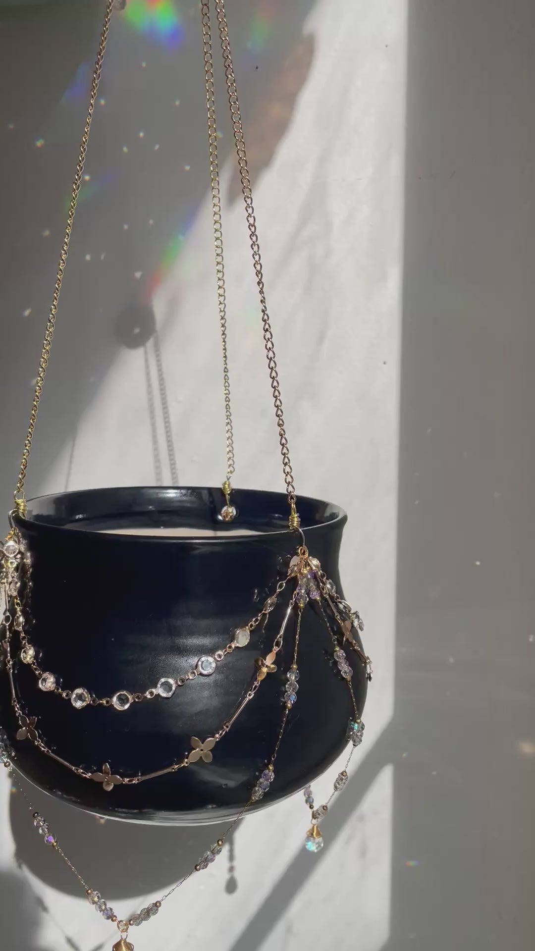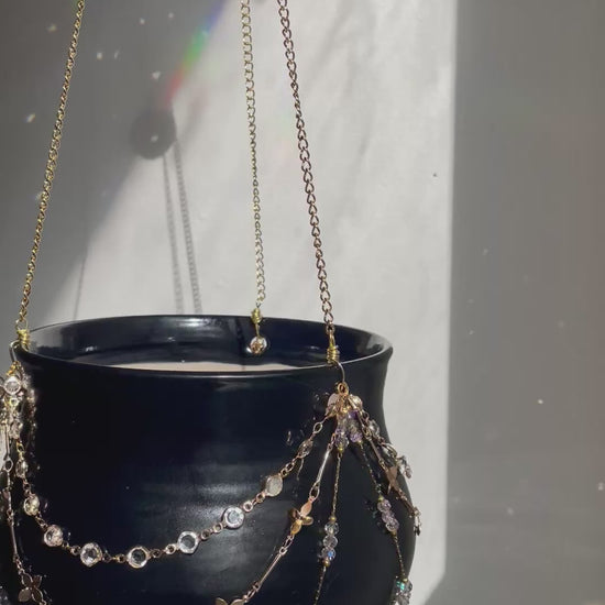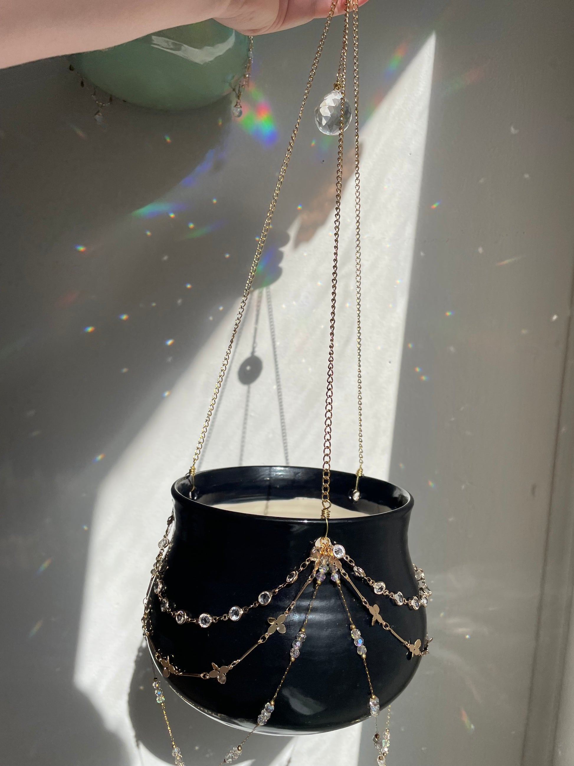 Ceramic vessel thrown on the potter’s wheel and fired to Cone 6, then adorned with jewelry chain and glass prisms to create a magical hanging planter like no other.