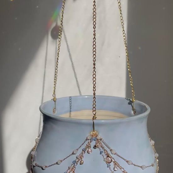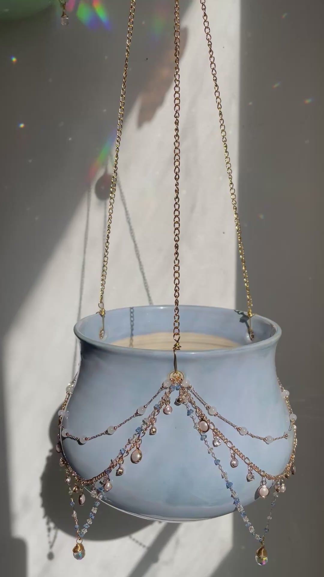 Ceramic vessel thrown on the potter’s wheel and fired to Cone 6, then adorned with jewelry chain and glass prisms to create a magical hanging planter like no other.