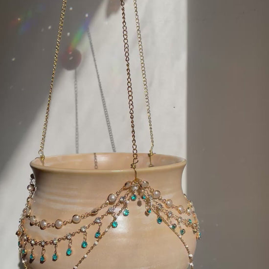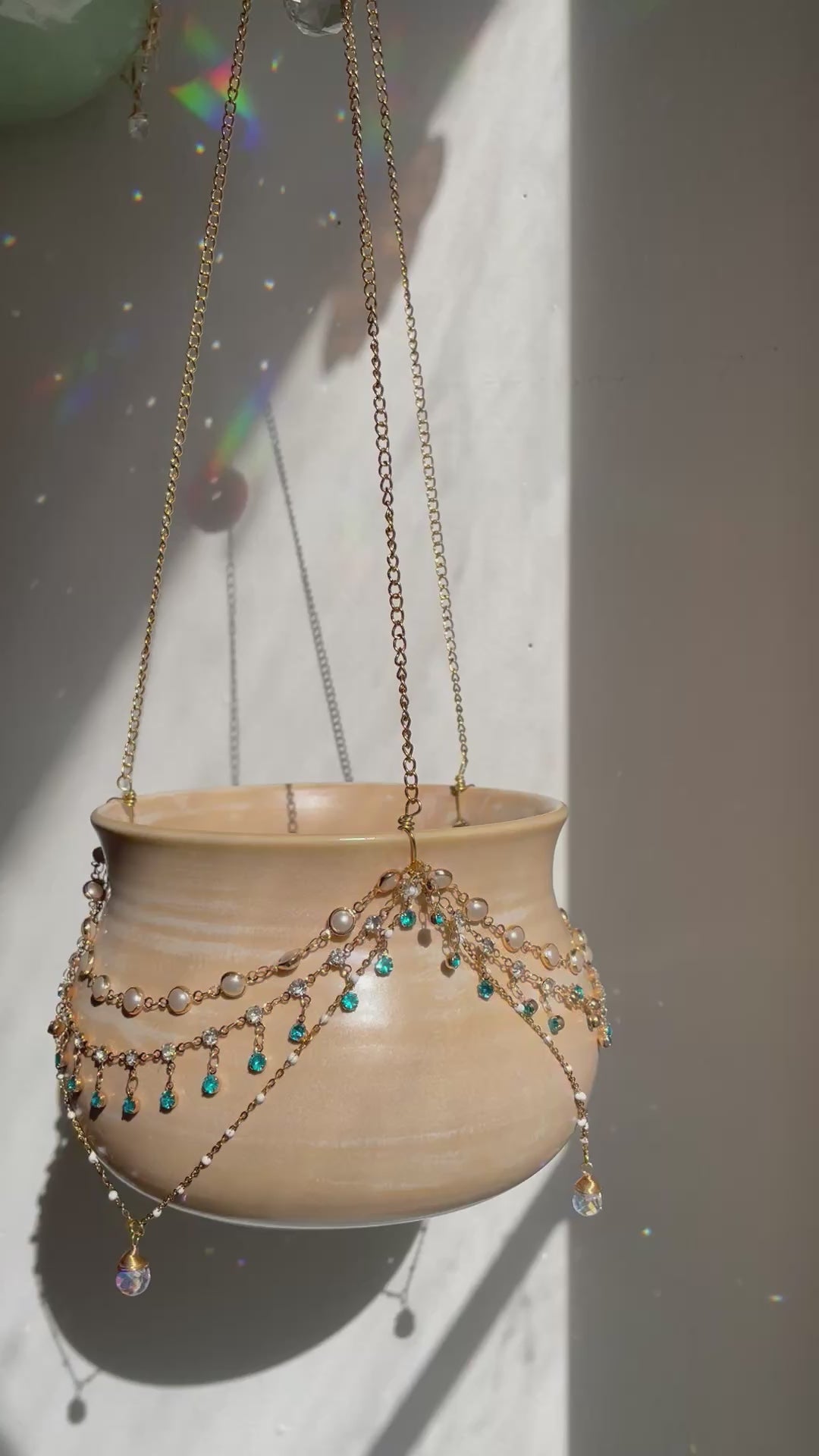 Ceramic vessel thrown on the potter’s wheel and fired to Cone 6, then adorned with jewelry chain and glass prisms to create a magical hanging planter like no other.