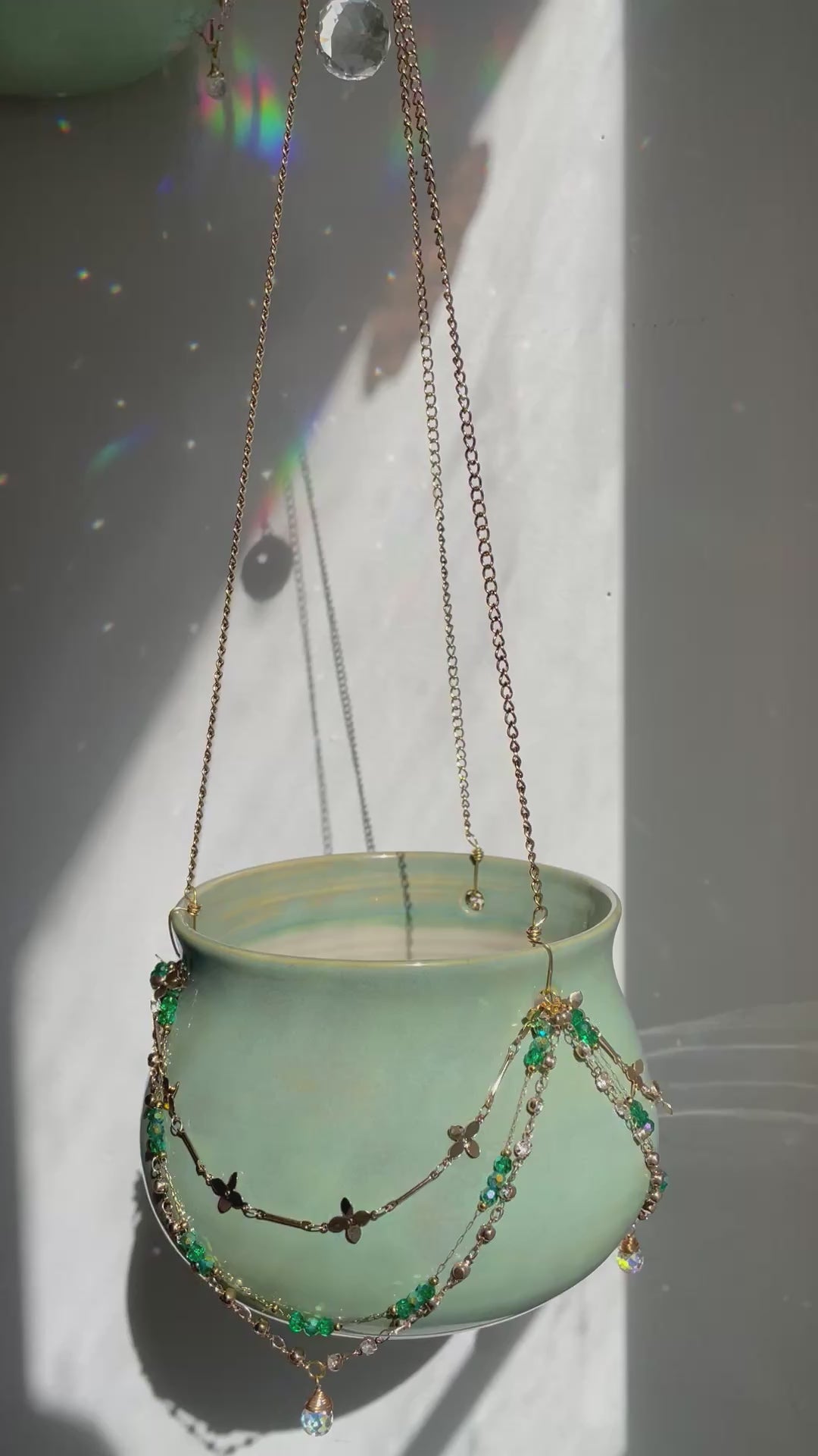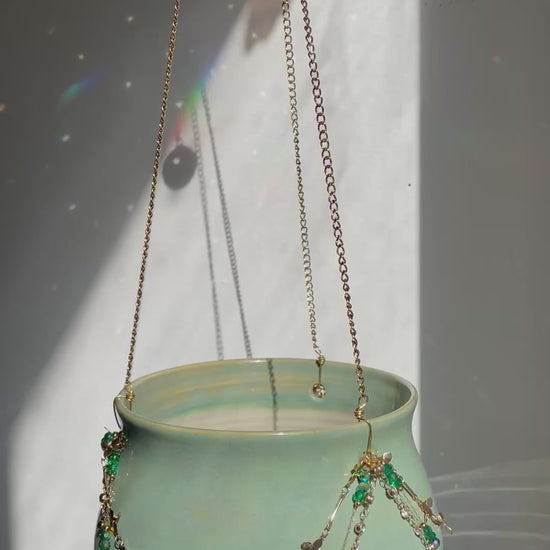 Ceramic vessel thrown on the potter’s wheel and fired to Cone 6, then adorned with jewelry chain and glass prisms to create a magical hanging planter like no other.