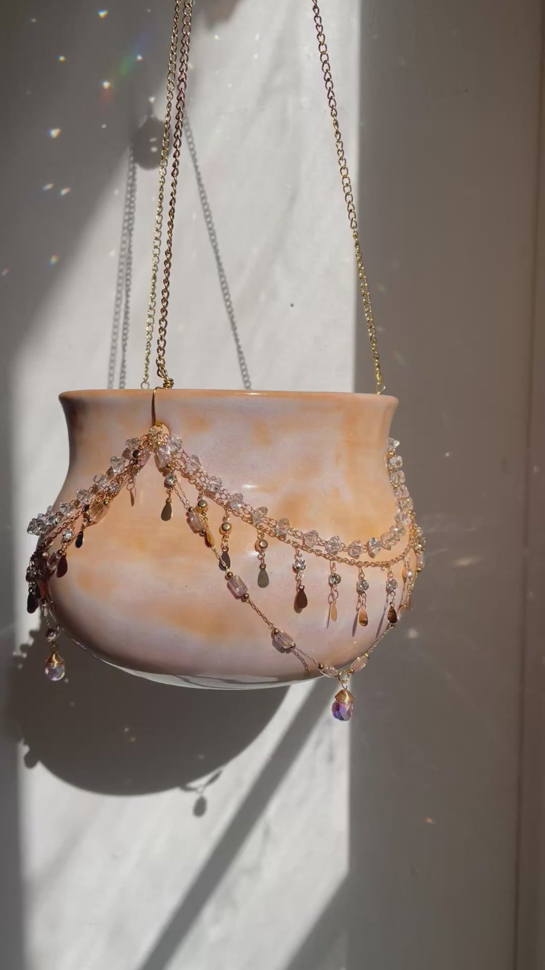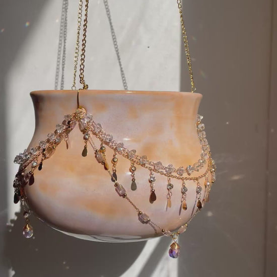 Ceramic vessel thrown on the potter’s wheel and fired to Cone 6, then adorned with jewelry chain and glass prisms to create a magical hanging planter like no other.